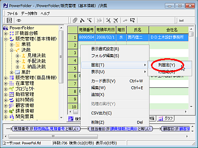 | 「見積番号」の列にカーソルを置き右クリック、メニューから列固定を選択 |