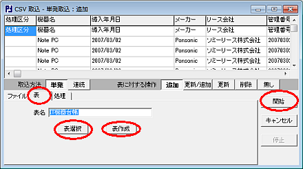 この例のように、表を開いた状態でCSV取込を行った場合は、開いていた表が取込先となっていますが、ここで取込先を変えたり(「表選択」ボタン)、作 成したり(「表作成」ボタン)もできます。