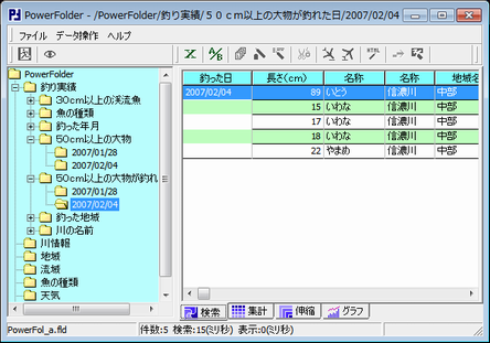 | 「2007/02/04」の実績の全てが、[検索表示]に一覧表示されます。 「長さ(cm)が50と等しいか大きい」ものは列挙する際の条件で、列挙した後の結果の釣れた日そのものには何も条件は付いていません。 この例のように、列挙フォルダには、列挙時条件の着目するカラムと列挙するカラムを別にして設定することができます。 例A、Bでデータの整理の趣旨が異なります。 例Aでは、50cm以上の大物が釣れた日を列挙して、列挙されたある日のフォルダを開くと、その日に釣れた50cm以上の大物が表示されます。 大物がいつ釣れてそれは何であったか条件の対象そのものが分かります。 例Bでは、50cm以上の大物が釣れた日を列挙して、列挙されたある日のフォルダを開くと、その日に釣れた全ての魚の実績が表示されます。 大物が釣れた日の全容が分かります。 このように、検索条件に合致したそのものだけではなく関わるものを調べてみたい場面はよくあります。 例えば、臨床検査の結果で、ある条件(複数試験項目に条件を与えて)に引っかかった患者の全ての試験項目について調べたい。 ある商品を購入した顧客のがその日(週、月、年)に購入した他の商品を調べたい。 PowerFolderで用意された3種類のフォルダを組み合わせることにより、多彩で分かり易いデータの整理・分類ができます。 |