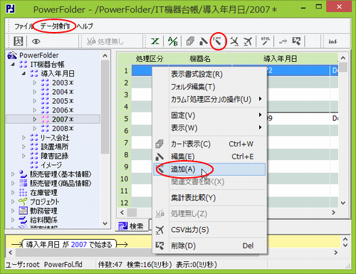 をクリックするか、検索表示領域でマウスの右クリックでメニューを表示し「追加」を選ぶか、「データ操作」メニューから「追加」を選択します。