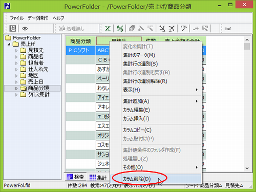 カーソルを「見積先」列の範囲内に合わせ、マウスの右ボタンを押し「集計操作メニュー」から「カラム削除」を選択します。
