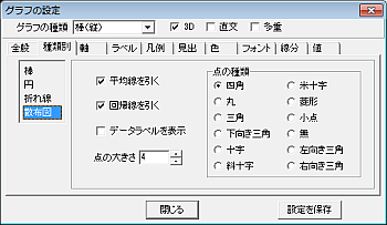 引く 散布図の平均線を引くかを指定します。 回帰線を引く 散布図の回帰線を引くかを指定します。 データラベルを表示 散布図のデータラベルを表示するかを指定します。 点の大きさ データ点の点の大きさを指定します。 点の種類 データ点の種類を指定します。 |