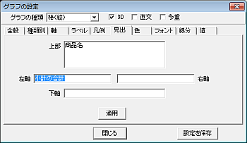 上部 上部の見出しを指定します。 左軸 左軸の見出しを指定します。 右軸 右軸の見出しを指定します。 下軸 下軸の見出しを指定します。 適用ボタン 指定した値をグラフに反映します。 |