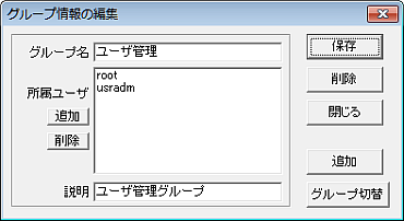 「削除」新しくグループを追加する時は、「追加」ボタンをクリックします。 グループ名で示されるユーザを削除します。