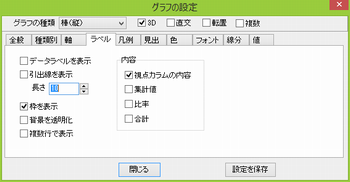 奥行 3Dの場合、奥行を指定します。 回転 3Dの場合、回転を指定します。 下方にあるスライダーバーは横回転。 グラフ線幅 3Dでない場合、折れ線、等の線幅を指定します。 位置 3Dの場合、グラフの位置を指定します。 下方にあるスライダーバーは横方向。 余白 上下左右の余白を指定します。 全体倍率 3Dの場合、グラフの大きさを指定します。 文字倍率 文字部分の大きさを指定します。 |