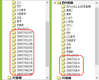 例えば、「釣った日」の期間仕分フォルダを削除し、釣った日の列挙フォルダを作成します。