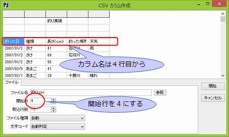 また、カラム名が先頭から始まらない場合は「開始行」で調整します。