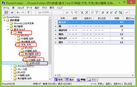 「伸縮」、「パレート図」の後には分類するカラムの名前のフォルダが並び、その下位にはフォルダ名と対応するカラム名の列挙フォルダが置かれます。さらにその下位には上のものを除いたカラムの列挙フォルダが次々に出現します。例えば、「釣った日」の下位は、釣った日の列挙→川の名称の列挙→魚の名称の列挙→天気の列挙、となります。