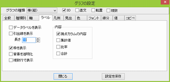 奥行 3Dの場合、奥行を指定します。 回転 3Dの場合、回転を指定します。 下方にあるスライダーバーは横回転。 グラフ線幅 3Dでない場合、折れ線、等の線幅を指定します。 位置 3Dの場合、グラフの位置を指定します。 下方にあるスライダーバーは横方向。 余白 上下左右の余白を指定します。 全体倍率 3Dの場合、グラフの大きさを指定します。 文字倍率 文字部分の大きさを指定します。 |