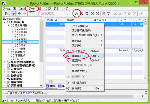 をクリックするか、検索表示領域でマウスの右クリックでメニューを表示し「編集」を選ぶか、「データ」メニューから「編集」を選びます。