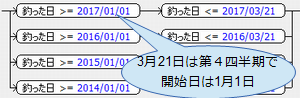 | 年度開始日「4/1」、基準日「2017/03/21」、範囲「年度」、繰返数「5」を指定した時の検索条件は次のようになります。 |