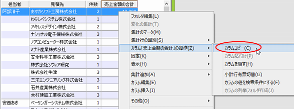 | @ | カーソルを「売上金額の合計」列の範囲内に合わせ、マウスの右ボタンを押し「集計操作メニュー」の中から「カラム○○の操作」→「カラムコピー」を選択します。 |