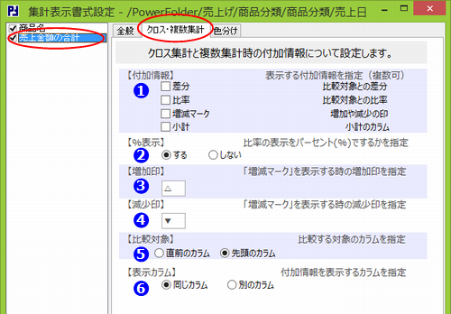 集計表示書式設定のウィンドウが表示されたらカラムの一覧で「売上金額の合計」が選択されているのを確認し、【クロス・複数集計】タブを表示します。