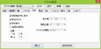 奥行 3Dの場合、奥行を指定します。 回転 3Dの場合、回転を指定します。 下方にあるスライダーバーは横回転。 グラフ線幅 3Dでない場合、折れ線、等の線幅を指定します。 位置 3Dの場合、グラフの位置を指定します。 下方にあるスライダーバーは横方向。 余白 上下左右の余白を指定します。 全体倍率 3Dの場合、グラフの大きさを指定します。 文字倍率 文字部分の大きさを指定します。 |