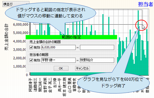 下の例では担当者の範囲は無効にし売上金額の合計だけを有効にしています。