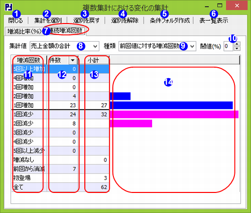 【連続増減回数】タブの時表示されるのは次の6の表です。