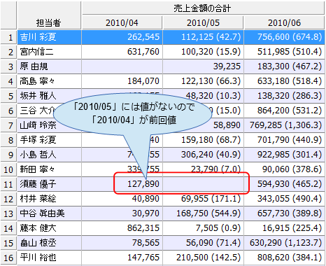 集計表示は以下のようになります。 最後の集計は「2010/06」、前回値は「2010/05」ですが、11行目だけは「2010/04」が前回値になります。 |